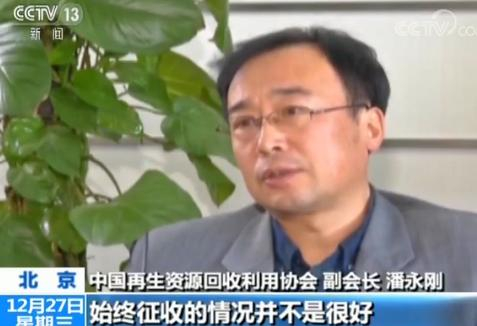 中国再生资源回收利用协会 副会长 潘永强:(补贴基金)每年缺口大概在30亿左右,增收一般是两种形式,一种是海关,海关代售代缴,这部分还是比较不错的;国内部分有各级的税务机关,进行代征,在代征过程当中由于多种原因,始终征收的情况并不是很好,所以造成每年将近30多个亿的一个缺口,但是现在由于资金补贴不到位,相当多的企业,处于停产或者半停产的状态。