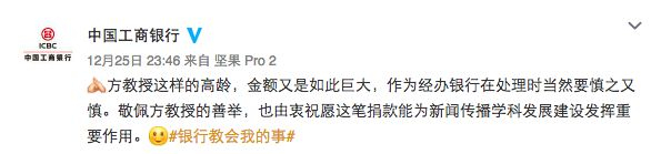 方教授这样的高龄,金额又是如此巨大,作为经办银行在处理时当然要慎之又慎。敬佩方教授的善举,也由衷祝愿这笔捐款能为新闻传播学科发展建设发挥重要作用。