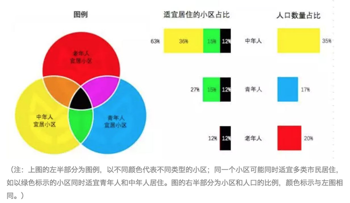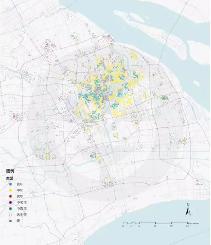 适合中年人的小区覆盖了绝大部分的外环以内地区,并在外环以外沿地铁线路呈串珠状分布,在浦东尤其多。可供选择的房子也是非常充裕的(已有的小区数量占比63%远远大于人口需求占比35%)