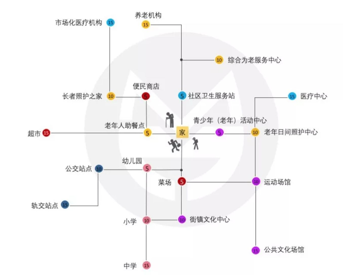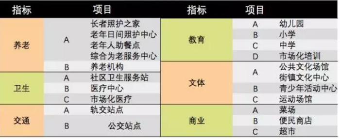 指标共分养老、卫生、交通、教育、文体、商业6个大类,进一步划分为长者照护之家、医疗中心、轨交站等21个小类。