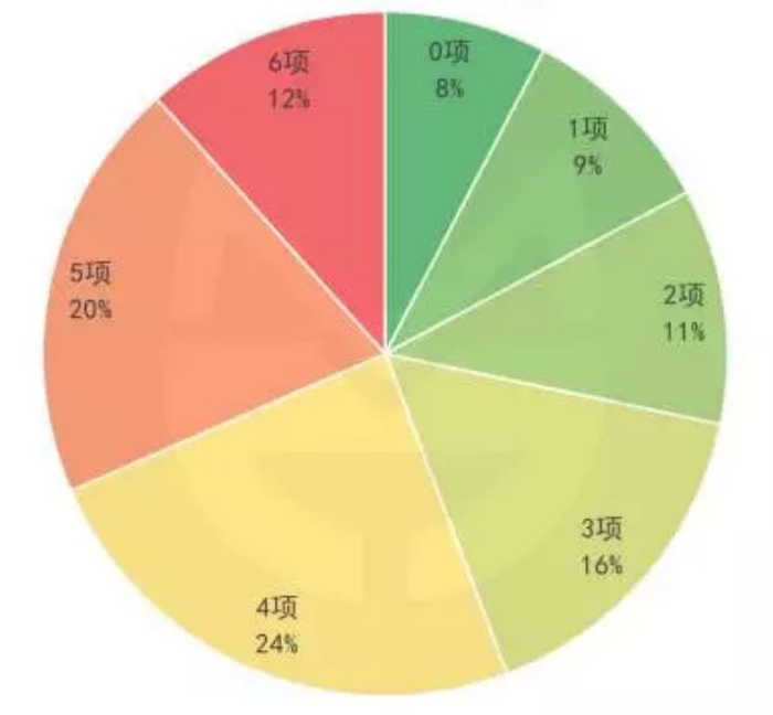 根据计算结果,在1万个小区的样本量内,6项大类全部达标的有12%,尚有44%的小区达标类型不足3项。