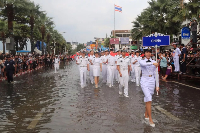 11月19日,泰国芭提雅滩前大道,21名郑州舰舰员组成的方队代表中国海军参加城市阅兵游行。周小舟 摄