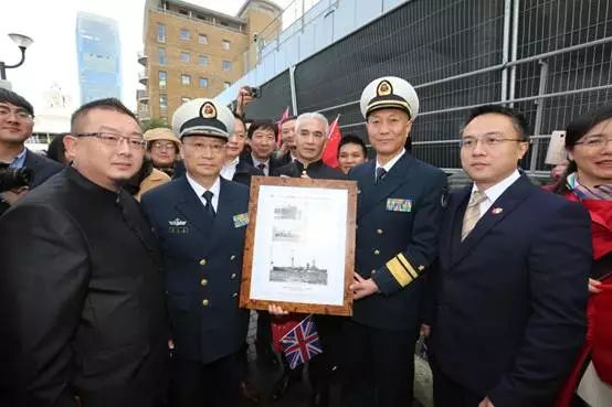 英国北部华人企业家协会向编队指挥员王仲才少将赠送一幅战舰图。
