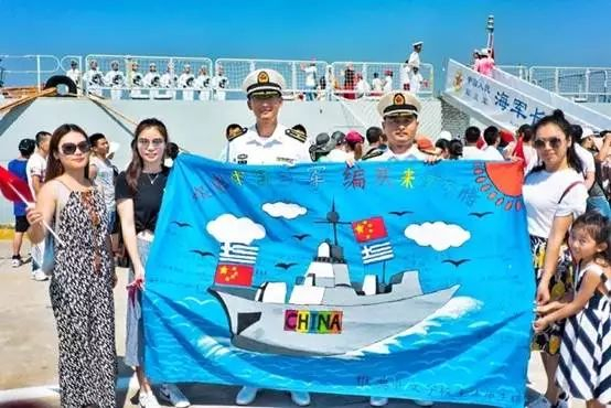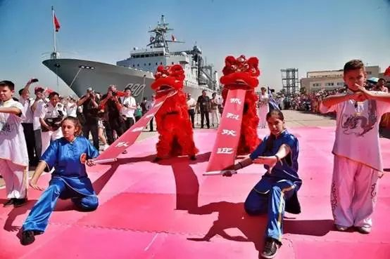 希腊民众用中国传统舞狮表演欢迎编队到来。