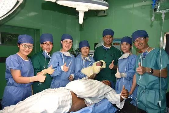 9月21日,在中国海军和平方舟医院船手术室,医护团队与塞拉利昂产妇拉玛图•芭及“和平”宝宝合影。(左四为接生医生胡电)韩英男 摄