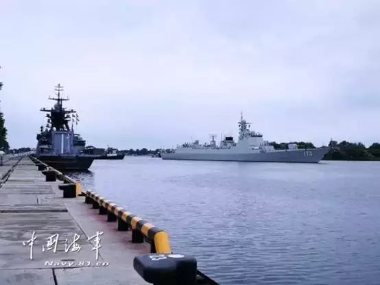 7月21日,参加中俄“海上联合—2017”演习的中国海军舰艇编队抵达俄罗斯波罗的斯克军港。图为中国海军导弹驱逐舰合肥舰进港。记者陈国全 摄