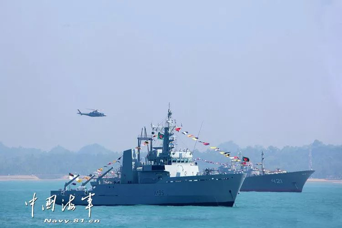 孟加拉国总统乘直升机检阅参演舰艇。吕德胜 摄