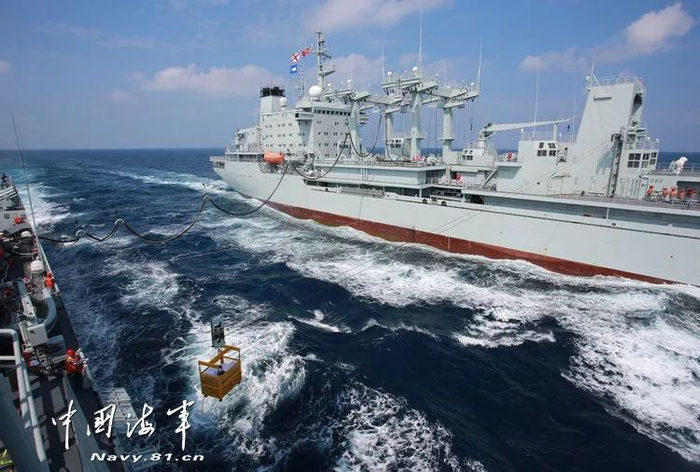 远洋综合补给舰青海湖舰采取横向补给的方式,为海口舰补给油料、淡水、干货。李昌寰 摄