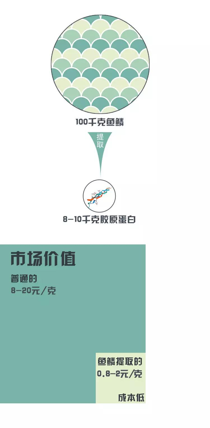 3鱼鳞变废为宝鱼类产量近几年逐步上升,被残忍丢弃的鱼鳞,可能带来环境污染。以鱼鳞为原料提取胶原蛋白,既充分利用了鱼鳞资源,也解决了口蹄疫、疯牛病可能带来的胶原蛋白安全问题,还降低了胶原蛋白制作成本。