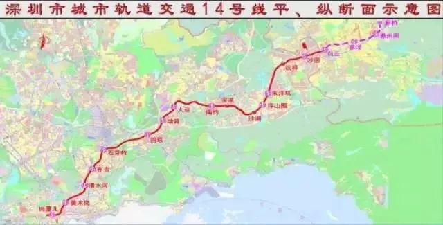 14号线串联福田中心区、清水河、布吉、横岗、龙岗大运新城、坪山中心区、坑梓、沙田等区域。线路起自福田中心区岗厦北枢纽,止于坪山区沙田站。起点预留延伸至会展中心条件,终点预留延伸至惠州条件。