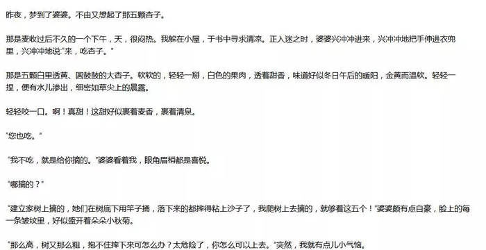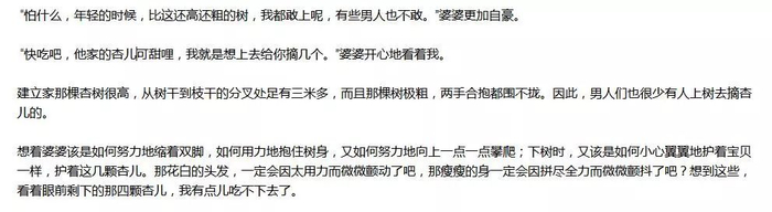知道婆婆受过的苦,因此,那五颗杏子,像五颗铜铃,挂在我的心窗之上,时时提醒我,婆婆对我的好;时时提醒我,要对婆婆好。自此,婆婆也有了让其他做了婆婆的人羡慕的地方。她们一起说闲话会说:“你看人家的媳妇,不叫娘就不说话。”“你看人家的媳妇,连贴身的内衣都给公公婆婆买……”每每听到这些,我都想笑,我知道这是婆婆说给她们的。我知道自己只不过是做了该做的,而且也是不值一提的事,在婆婆们眼里却成了大事。