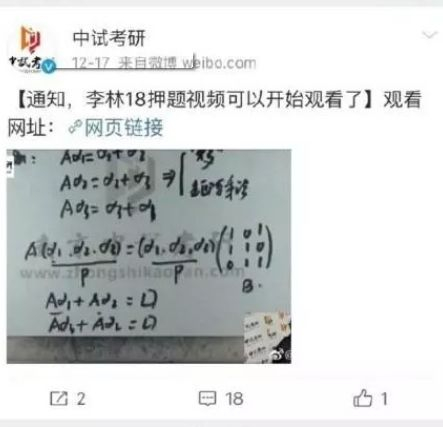 有网友发微博称,2018年全国硕士研究生统一招生考试数学科目出现“神押题”,一名教师在考前押题视频中举的例题与实际考试试题十分相似。