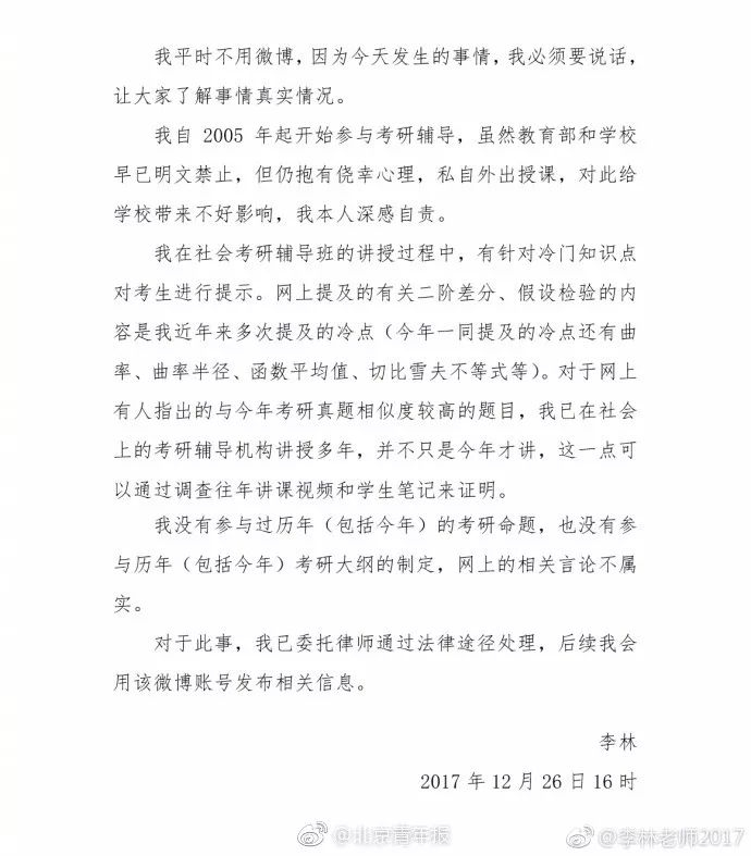 “我校在《关于严禁举办考研辅导班的通知》中明确规定:教师不得以任何形式参与考研辅导活动,包括社会上的考研辅导活动,对教师李林参与社会考研辅导活动的行为,学校将作出严肃处理,处理结果将及时向社会公布。”