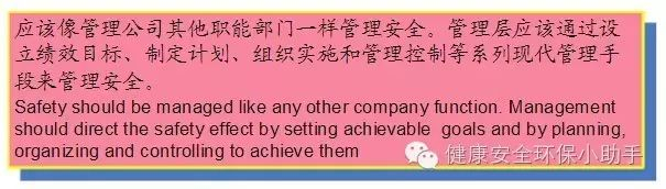 管理层应该通过设置安全目标、计划、组织和管理机制引导安全工作,明确各级主管人员的安全责任,并且赋予他们的相应的权力。在这里“主管”这一词不仅指现场监督的管理人员,包括从现场班组长到企业高层的各级管理人员。