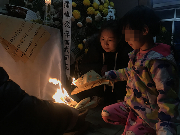 家里坐满了帮忙料理后事的亲朋和同事。妻子倪莎打开电视准备看中央电视台对李国武的报道,所有人也都围着电视站起来,6岁的女儿被裹在其中。