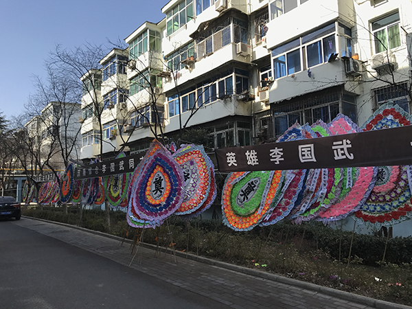 李国武家的小区楼下摆了长长一排各个单位送来的白色花圈,上面写着“悼念英雄李国武”之类的话。