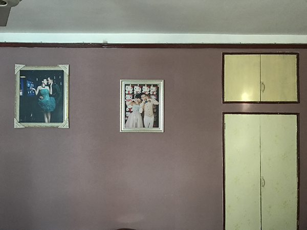 李国武的家是父亲单位分的家属房,只有居住权,刚搬进来一个月,家里的门窗装修都是李国武做的,他每天下班,就动手做一些。屋子里贴了粉色和紫色的墙纸,墙壁上挂着他和倪莎大幅的结婚照,显得很温馨。
