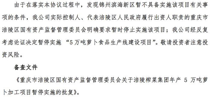 对于项目的暂停,12月25日公告中,涪陵榨菜解释称,