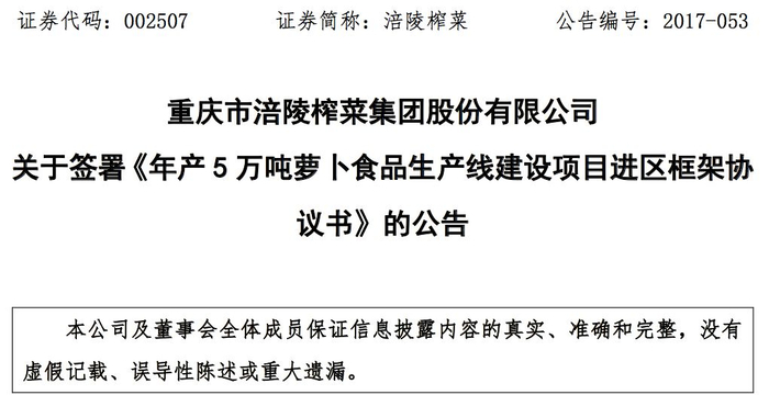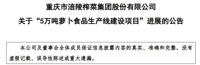 12月25日晚间,涪陵榨菜发布公告称,经反复考虑论证,决定暂停实施“5万吨萝卜食品生产线建设项目”。