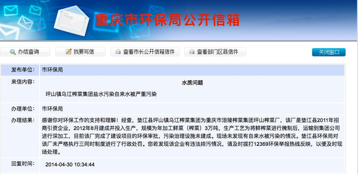 据了解,这并非涪陵榨菜首次遭到处罚。2013年3月,重庆市环保局接到坪山镇村民投诉,指坪山榨菜厂没有按规定排放污水,严重污染当地井水和土地,并提出市环保局可以出面检验田地是否受到污染。