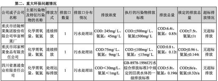 经历了环保问题之后,涪陵榨菜如今更近重视污染问题。例如,在2017年中期报告中,集团就公布了重大环保问题情况。今年10月,集团还公告称,拟投资建设“白鹤梁榨菜厂榨菜盐水回用处理项目”。