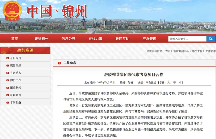 虽然签订框架协议仅三个多月,但涪陵榨菜筹划相关事宜至少已经大半年。2017年4月17日锦州市政府官网刊发的锦州市商务局工作动态显示,“涪陵榨菜集团项目投资部部长余帮兵、采购部部长陈林来我市进行考察,并就项目合作事宜与我市相关地区负责人进行深入交流。”