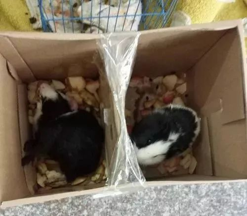蒋胜说,当天下午5点,他找来一个鞋盒,用纸板分成两个小隔间,然后把两只荷兰鼠分别放进去。