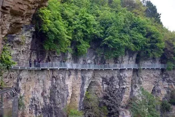峡谷半山腰有玻璃栈道,光是看看就令人肾上腺素飙升。栈道一边是断壁悬崖,一边则是惊险的深渊,脚下是透明的玻璃栈道,视线穿过栈道,能将谷底的景色一览无余。