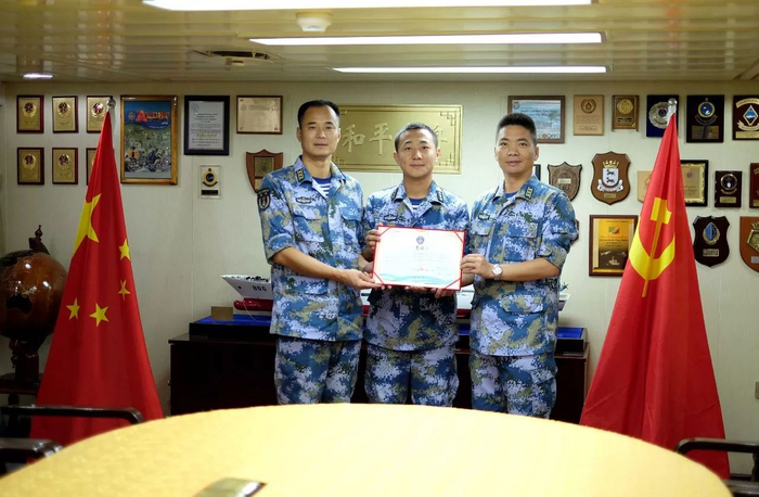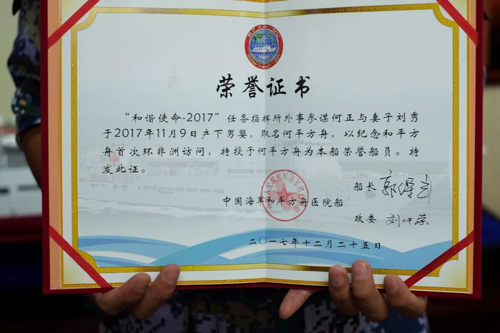 12月25日,中国海军和平方舟医院船举行了一场温馨而特殊的仪式,船长郭保丰、政委刘仲荣将授予何平方舟荣誉船员证书交给何正,以表达美好祝福。
