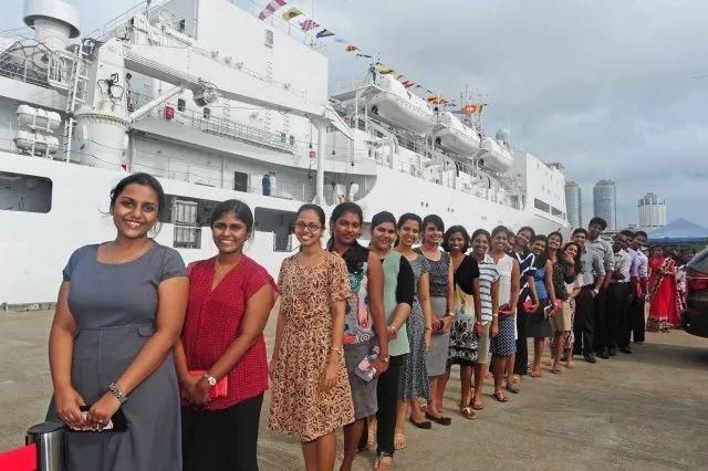 8月8日,斯里兰卡医学院学生在排队参观和平方舟医院船。