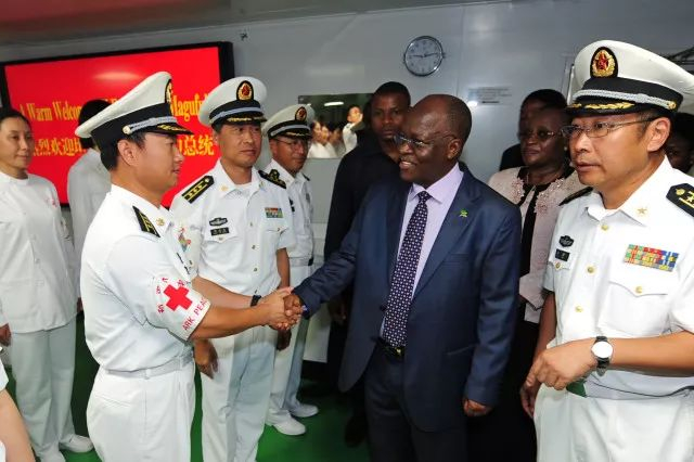 11月26日,在中国海军和平方舟医院船,坦桑尼亚总统马古富力与海上医院领导亲切握手,用中文说谢谢。