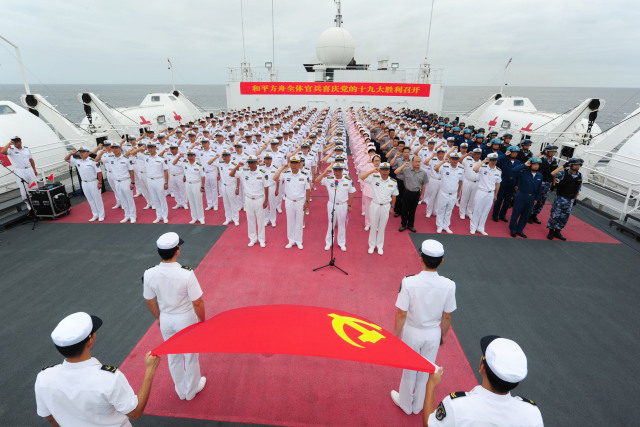 10月18日,和平方舟医院船在大西洋举行重温入党誓词仪式,喜庆党的十九大胜利召开。