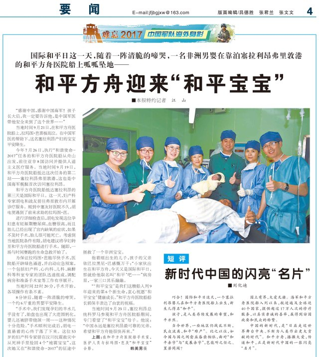中国海军和平方舟医院船,于7月26日从舟山启航执行“和谐使命-2017”任务,在指挥员管柏林、政委金毅的率领下,赴吉布提、塞拉利昂、加蓬、刚果(布)、安哥拉、莫桑比克、坦桑尼亚及东帝汶访问并提供人道主义医疗服务,技术停靠斯里兰卡、西班牙,期间位亚丁湾、吉布提为我护航官兵和驻吉官兵、施工人员进行医疗巡诊。历时155天,逆时针环非洲一圈,航2.87万余海里,被誉为新时代中国的 “闪亮名片”。