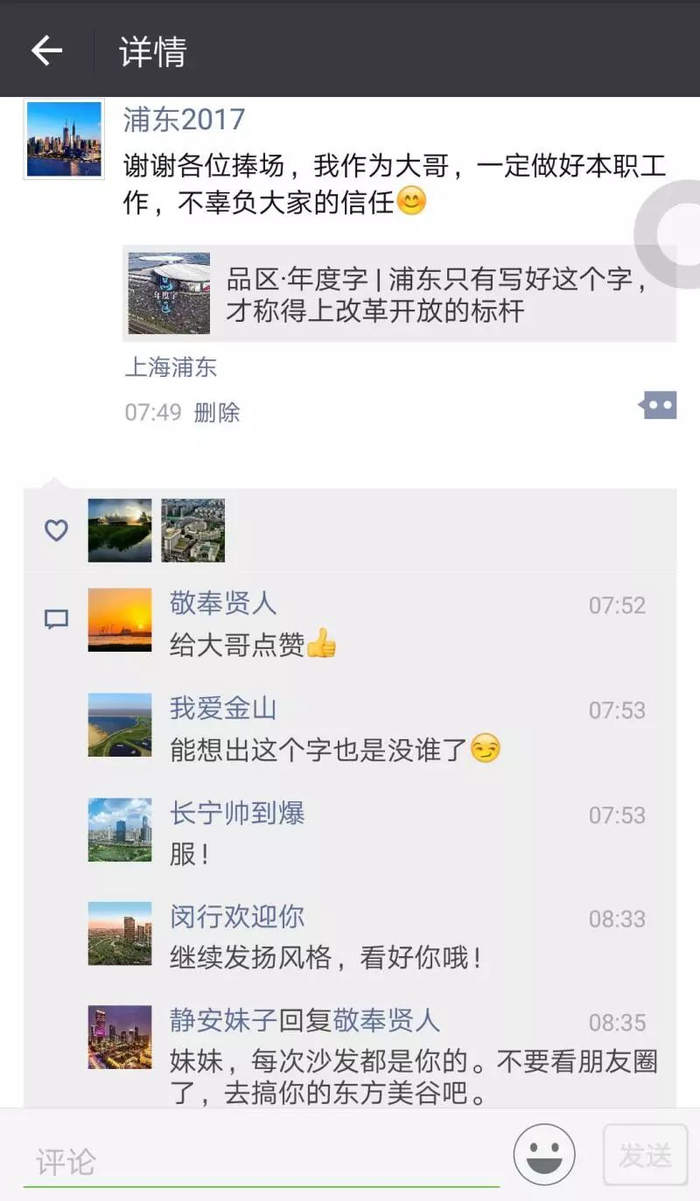 在网友们的回复中,也有让小编颇为服气的选字。比如网友“htliao”提名了“通”字,既包含了滨江贯通这样今年数一数二的大工程,也体现了浦东和上海自贸试验区畅通信息流、资金流、人才流和物流的愿景。
