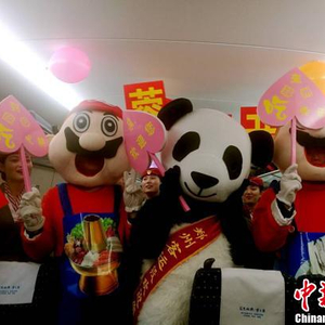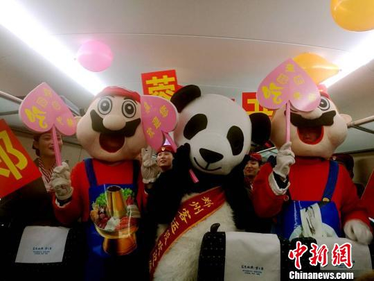 与此同时,熊猫、烩面、火锅三个具有地方特色代表的卡通人物的出现,给旅客们带来了不小惊喜。卡通三兄弟热情地同旅客们互动、合影留念。有旅客激动地说:太可爱了,真没想到,还没有到成都,在车上就见到了可爱的大熊猫了!