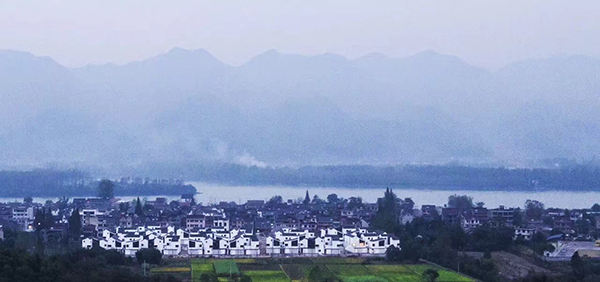 由320国道进入场口镇,再转入村道,隔着或墨绿或淡绿的隔离林与农田,一片泼墨山水似的建筑群倏地出现,带着温润且极具震慑力的美感,让人无法移开视线。走了近了看,与稍远处成形于不同年代的陈旧民居加以对比,却又能感受到这件作品的圆融与包容——村落里原有的新旧相糅、参差多态的建筑风貌,并未因此受到滋扰。