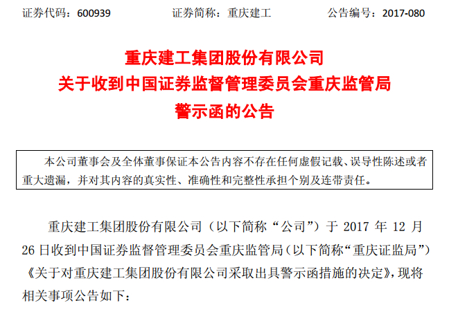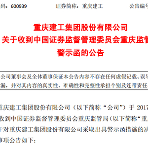 千龙网北京12月28日讯 重庆建工集团股份有限公司(以下简称“重庆建工”)28日发布公告称,因存在控股股东期间占用公司资金、财务核算不规范 、信息披露不准确、公司治理不规范的问题,公司被重庆证监局出具警示函。