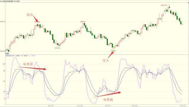当KD指标在较高或较低的位置形成了头肩形和多重顶(底)时,是进出场的信号。注意,这些形态一定要在较高位置或较低位置出现,位置越高或越低,结论越可靠。