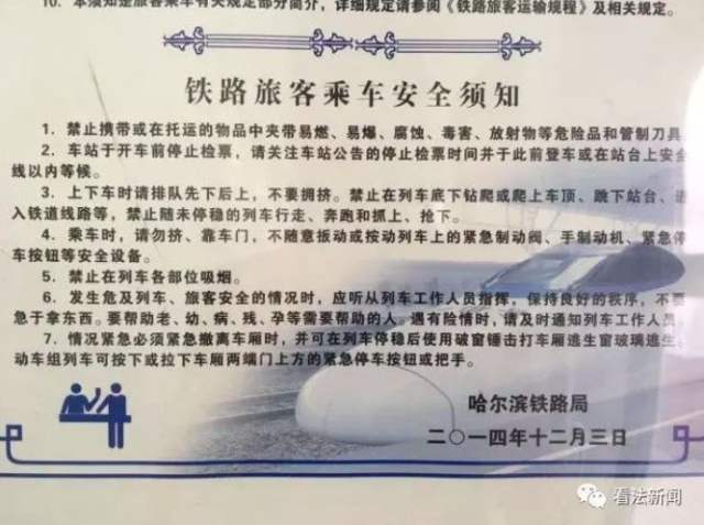 被告哈尔滨市铁路局(现更名中国铁路哈尔滨局集团有限公司)提交了一份名为《铁路旅客运输服务质量规范》(列车部分)的内部用书,认为哈尔滨铁路局是严格依照该法律法规操作,不存在违法。
