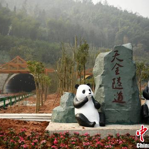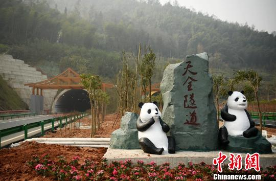 雅康高速沿线设计了“茶马古道、熊猫家园、红色泸定、康定情歌"等公路文化主题,天全隧道入口处的熊猫雕塑。 刘忠俊 摄