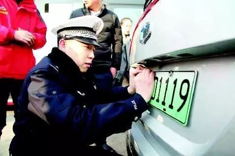 图为交警为新能源汽车安装首块专用号牌。 王昕 摄