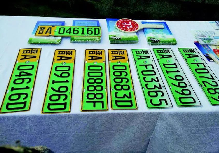 首发现场,交警展示了新的专用号牌,这种号牌长为480毫米,宽140毫米,其长度比普通号牌增加了40毫米。小型新能源汽车专用号牌底色采用渐变绿色,大型新能源汽车专用号牌底色采用黄绿双拼色,号牌上还增加了新能源汽车的专用标识。与普通汽车号牌相比,新能源汽车专用号牌号码由5位升为6位,在制作工艺上采用无污染烫印制作方式制作,同时增加了二维条码、防伪底纹暗记。