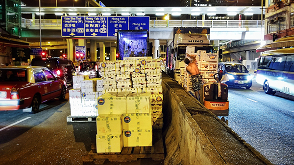 凌晨时份的果栏一带有其独特秩序,虽然搬运工人把货物堆满马路,但其他驶经车辆都会耐心等候。作者 摄