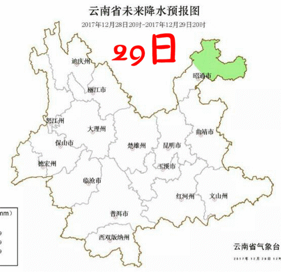 2017年12月30日:昭通北部阴冷有雨夹雪,昭通南部、曲靖、昆明、玉溪、楚雄东部和南部、文山、红河、普洱、西双版纳阴有小雨,其它地区多云。