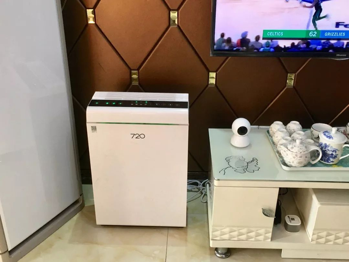 (杜先生家里摆放着空气净化器、安防摄像头各类智能产品)