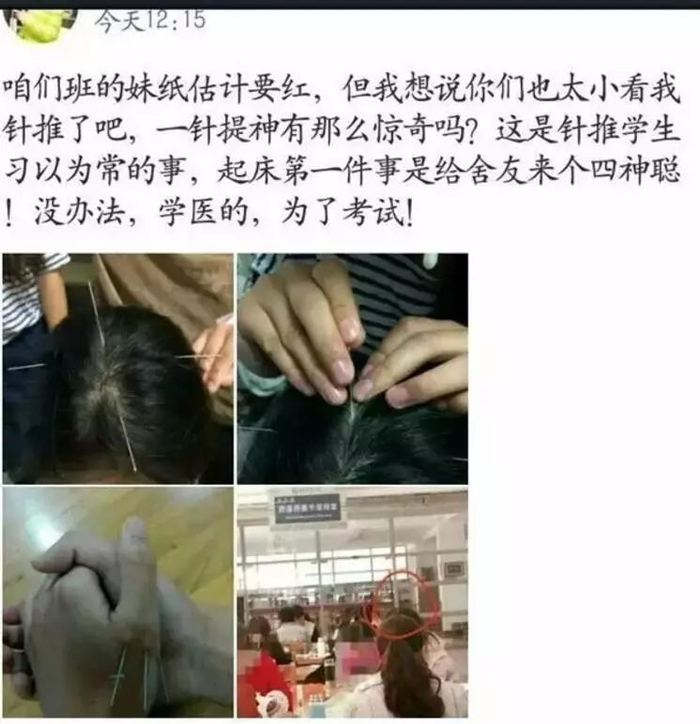 2017年伊始,就有网友爆料称云南中医学院针灸推拿专业的学生,期末考试为了给自己复习提神,用银针扎自己的百会穴和四神聪,开窍醒神学以致用。该校药学院团委书记杨永坚老师点赞:“中医学以致用,加油,可能考试就考银针。”