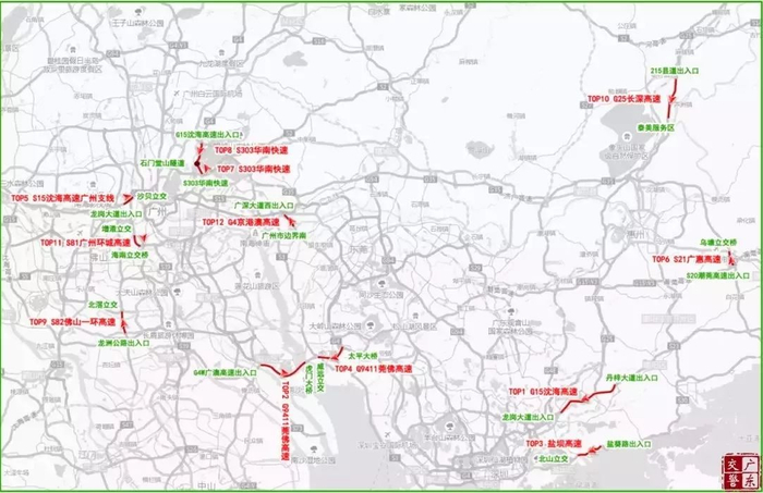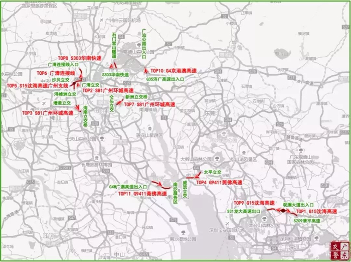 元旦假期车辆出行量增大,广东省内高速易出现拥堵缓行现象,出程时段易拥堵缓行高速主要集中在深圳市、广州市、东莞市,主要高速路段为: