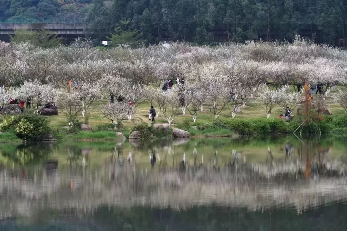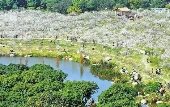 流溪梅园是东南亚最大的一片赏梅基地,这里有3000多亩梅林,始种于上世纪60年代,除种植的白梅品种外,还有较罕见的洒金梅。
