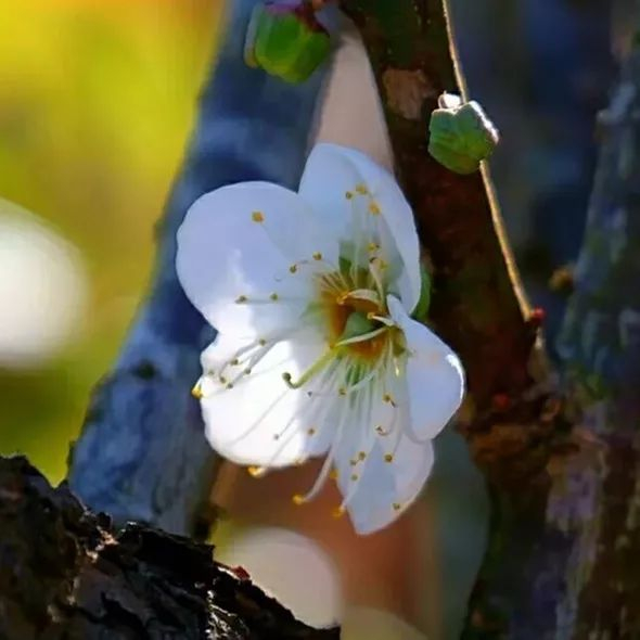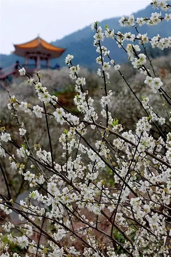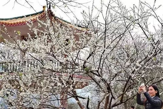 眼下已迎来第二弄盛花期,远远看去,梅花像覆盖在树上的零星白雪,微风过处,暗香浮动。