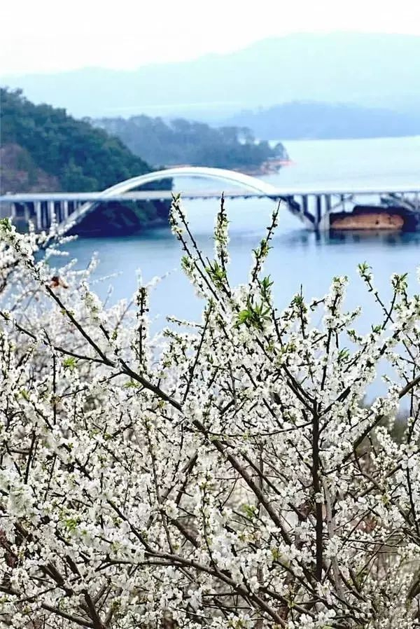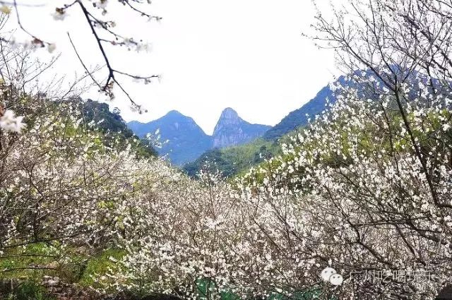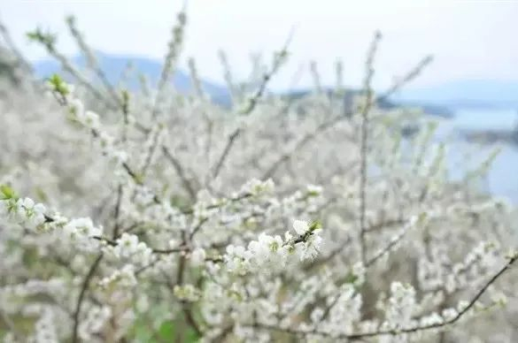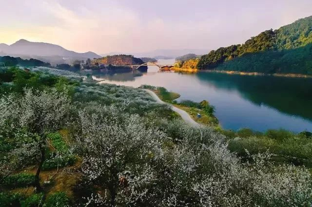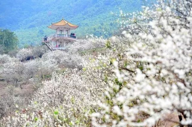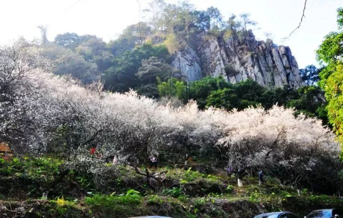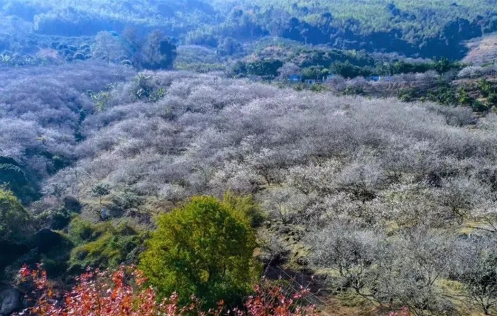 3000亩梅园10万多株梅树在枝头绽放一簇簇的白花,傲着寒冻怒放,依着山头连成白皑皑一片,南国香雪的胜景比雪景更胜一筹。